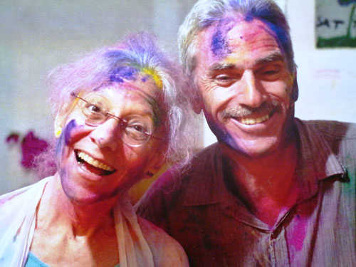 photo of me and Swar during a Hindu Spring Holi festival in Auroville, where it is mandatory that you get splashed with colored powder.