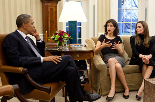 Zana Marjanovic at The White House, Washington, D.C. in the Oval Office with President Obama and Angelina Jolie(photo 2a, 10)