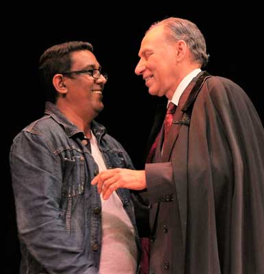 Ronald Rand with M. Safeer onstage of the Elphistone Theatre after Rand’s performance in his play, “LET IT BE ART!” at the Colombo International Theatre Festival, 2019