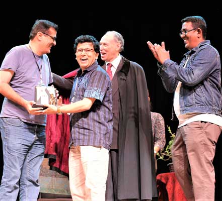 M. Safeer on stage at the Colombo International Theatre Festival with Ronald Rand as Dr. Asish Goswami presents the Festival Award to Aamir Nawaz, Director of the Pakistan production of “Book of Love” after their performance at the Festival, 2019