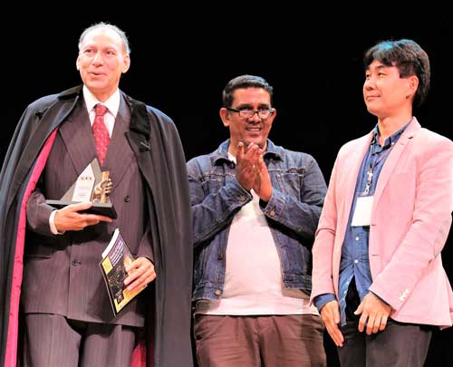 M. Safeer on stage with Ronald Rand receiving the Colombo Festival Award from Kakumoto Atsushi, after Rand’s performance in Colombo International Theatre Festival, 2019