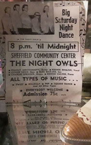 Poster from “The Night Owls” performing at Big Saturnday Night Dance in the 1950’s with Peanutt Montgomery, Ronnie English, Junior Lowe, Glen Rickard, Charles Springer and Donnie Culver – all for 75 cents!